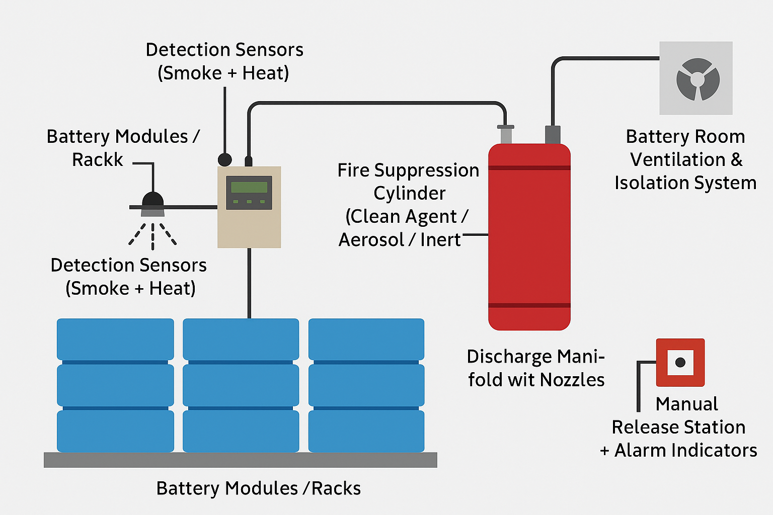 A BESS Fire Suppression System is a specialized automatic fire protection solution for Battery Energy Storage Systems, using clean agent gases, inert gases, or aerosol suppression to prevent and control lithium-ion battery fires.