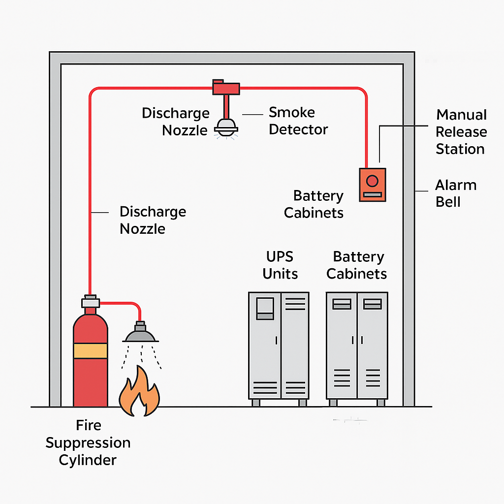 A UPS Fire Suppression System is an automatic fire protection solution designed to detect and suppress fires in UPS rooms and electrical enclosures where overheating or battery malfunction can cause ignition.