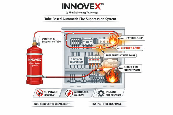 INNOVEX™ is a UL approved tube based automatic fire suppression system designed for electrical panels, control cabinets, MCC panels, server racks, UPS systems, EV chargers and industrial enclosures. Developed by Fire Engineering Technology, it provides smart heat detection and instant fire suppression at the source without sensors, wiring or power. Using a clean agent, non conductive and residue free technology, INNOVEX ensures fast response, zero downtime, low maintenance and future ready electrical fire protection.